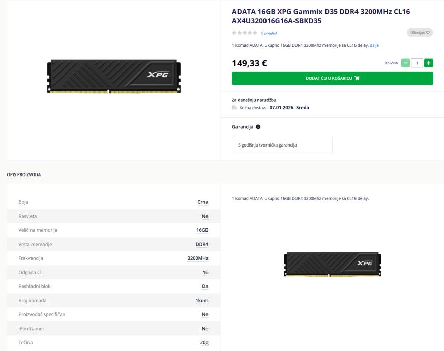 Ključne riječi: RAM, ADATA, GAMMIX, 3200Mhz, 16GB, DDR4, Radna memorija, CL16, novo, neraspakirano, jamstvo, garancija.