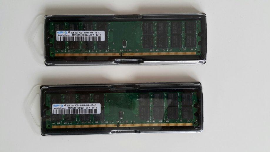 Samsung DDR2 memorije (2x4GB) 800MHz. U galeriji je benchmark s Aida64 na kojem su pokazane brzine i latencije memorije. Memoriju je prije kupnje moguce isprobati i testirati bilo kojim benchmarkom! Radi iskljucivo na AMD-ovim maticnim plocama!