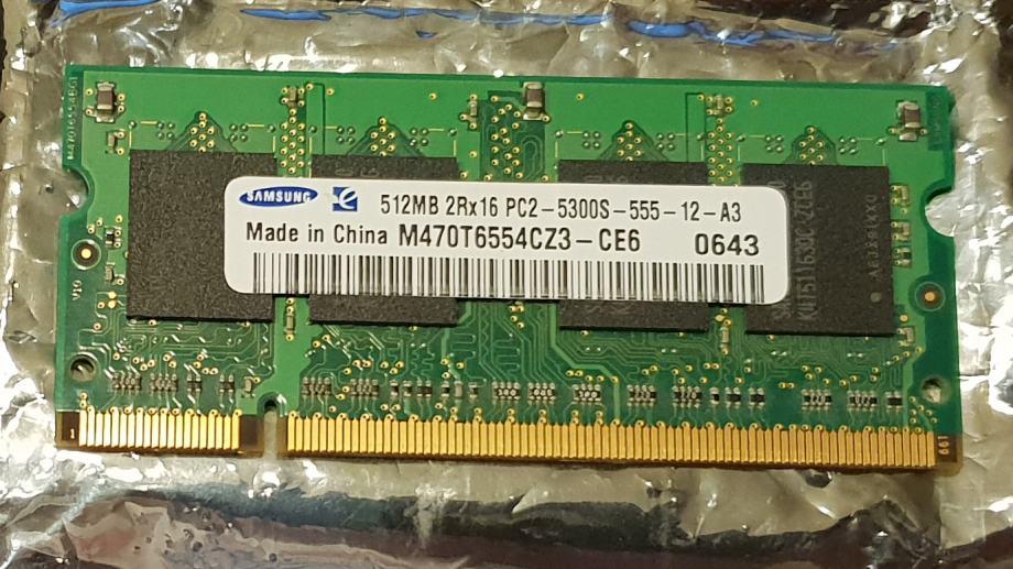 Prodaje se memorija za notebook (prijenosno računalo) Samsung 512MB 2Rx16 PC2-5300S-555-12 CL5 DDR2-667 SODIMM 200p M470T6554CZ3-CE6