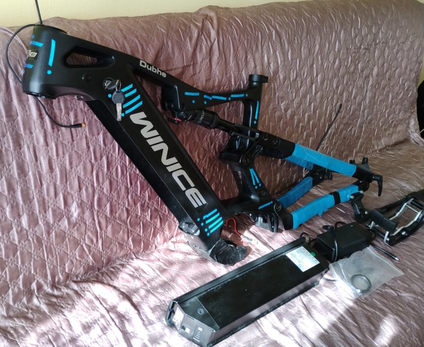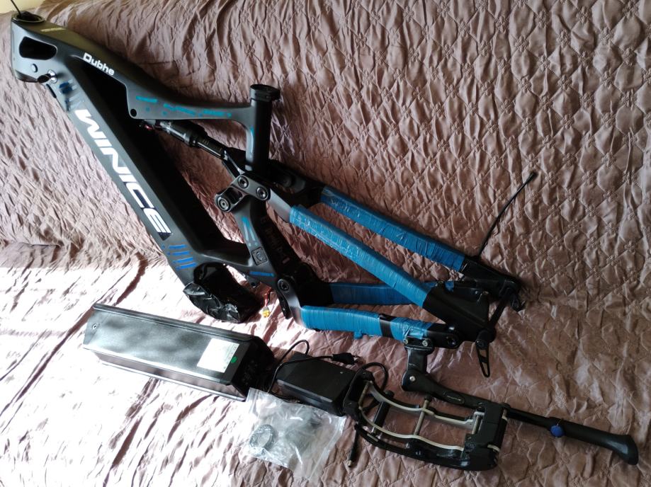 Prodajem Dengfu Winice mtb fullsuspension karbonsku ramu model e-55 za el bicikl 17" (M) i 29" kotače sa njegovom baterijom od 52v 20ah. U ramu je uključeno slijedeće: