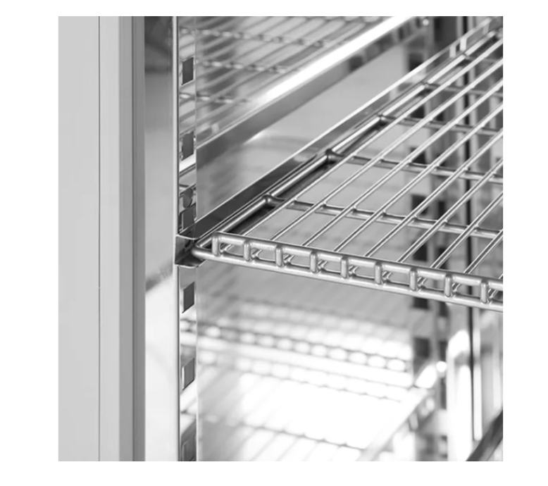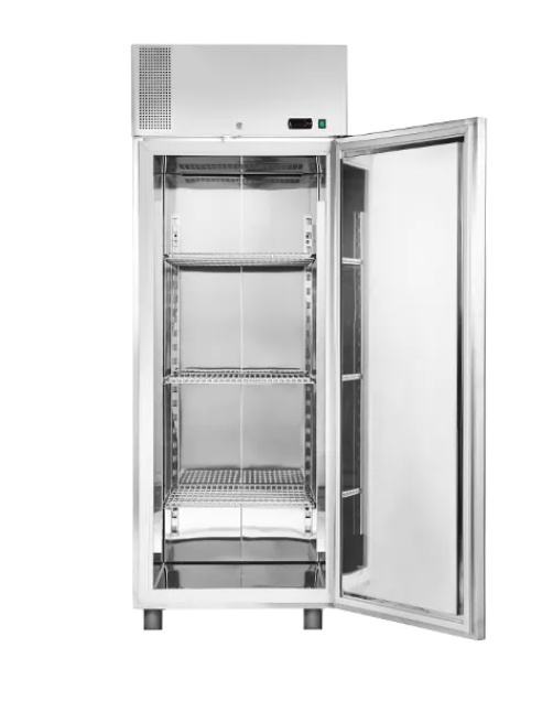 INOX hladnjak sa 3 police, ventilacijsko hlađenje, od nehrđajućeg čelika iznutra i izvana, pomične noge, elektronska kontrola temperature, digitalni prikaz temperature, automatsko odmrzavanje, bravica za zaključavanje i mogućnost otvaranja vrata s lijeve i s desne strane.