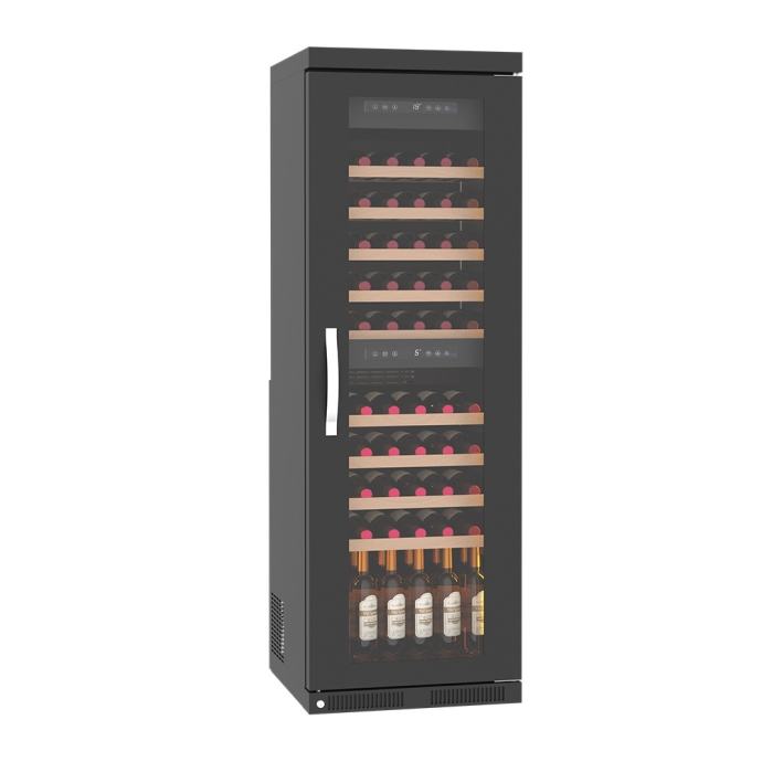 kapacitet: 72 boce, temperaturni raspon: +1/+10 °C i +10/+20 °C, materijal: AISI 430 (crna boja), vrata inox-staklena sa bravicom, LED rasvjeta, digitalni zaslon, police drvene sa vodilicama za izvlačenje, napon 230 V, snaga 0,4 kW, masa: 150/160 kg, dim. 600x660x1820 mm