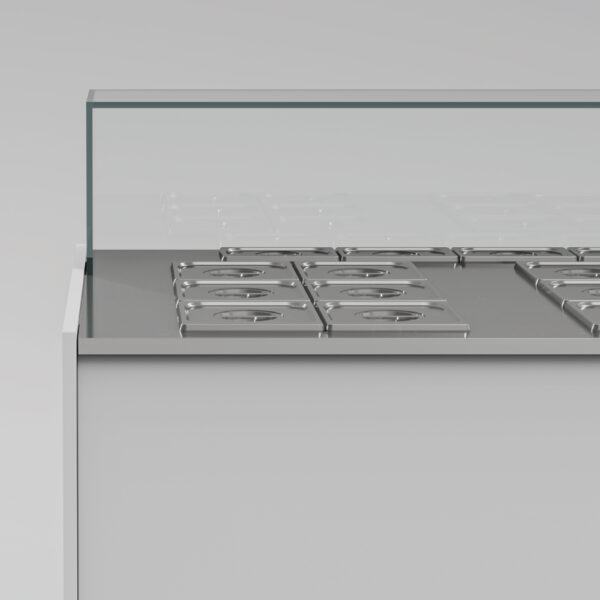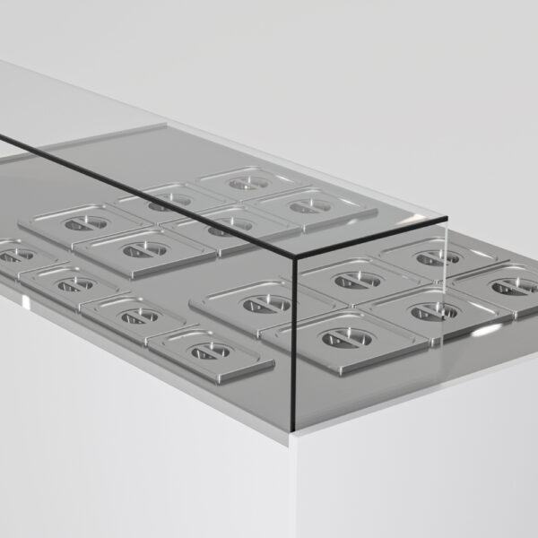 Omnia modularna vitrina 7 u 1 osmišljena je za one koji žele imati potpuno kontrolirane uvjete i savršenu prezentaciju proizvoda – sve u jednom rješenju. Umjesto da riskirate tvrdu “snježnu koru” na gelatu, suhe kolače ili praline bez sjaja, Omnia uklanja te brige.