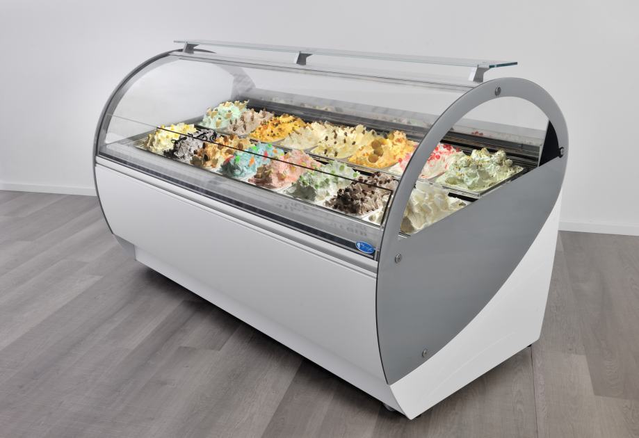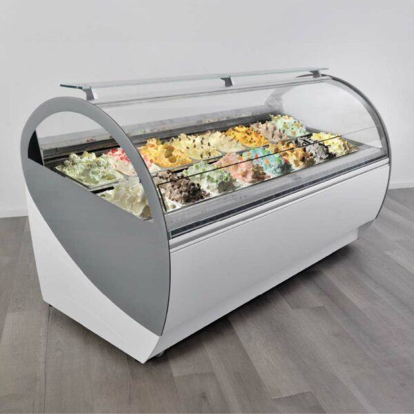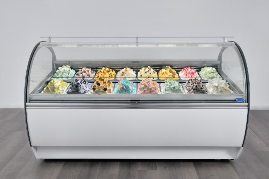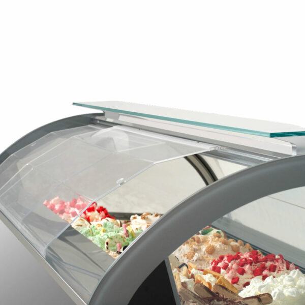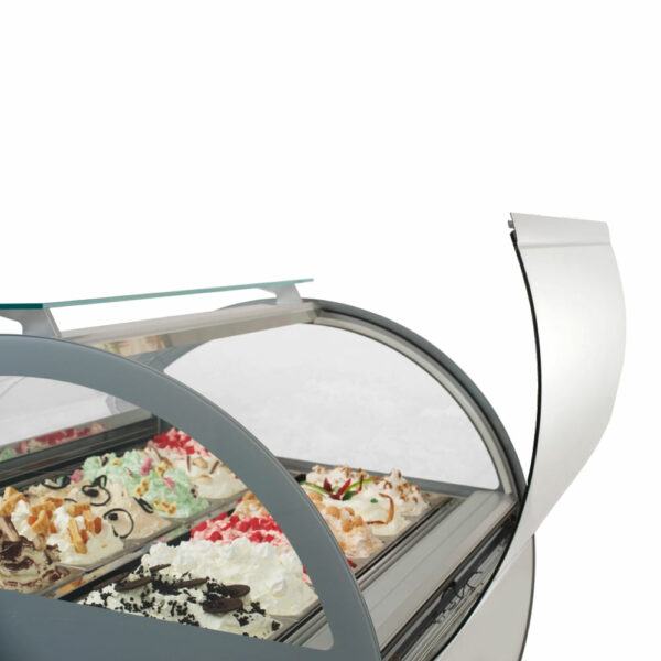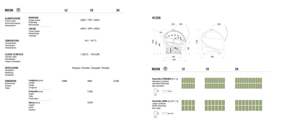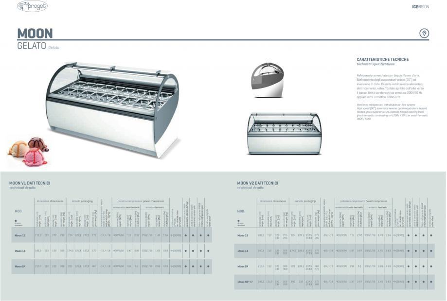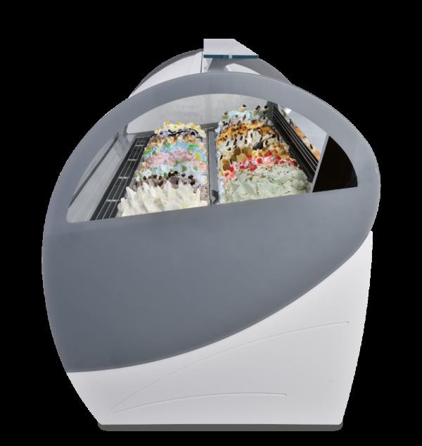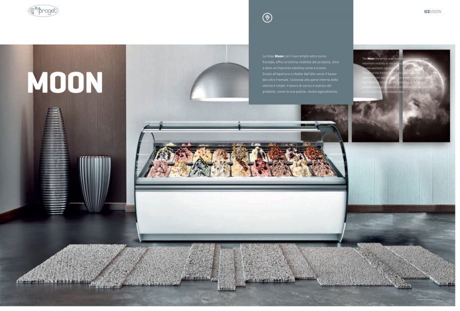 Moon vitrina dizajnirana je za gelaterije i slastičarnice gdje je izgled vitrine i preglednost proizvoda ključna. Stakla s elegantnim, mjesečevim zaobljenjima omogućuju neusporedivu vizualnu preglednost, dok dvostruki protok zraka i ventilirano hlađenje osiguravaju ravnomjernu i optimalnu temperaturu u oba reda kadica.