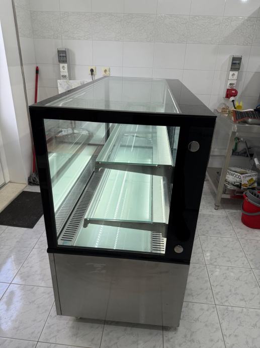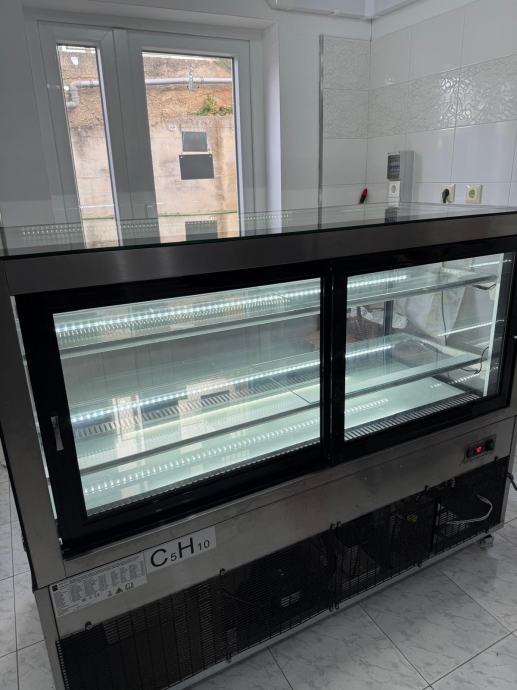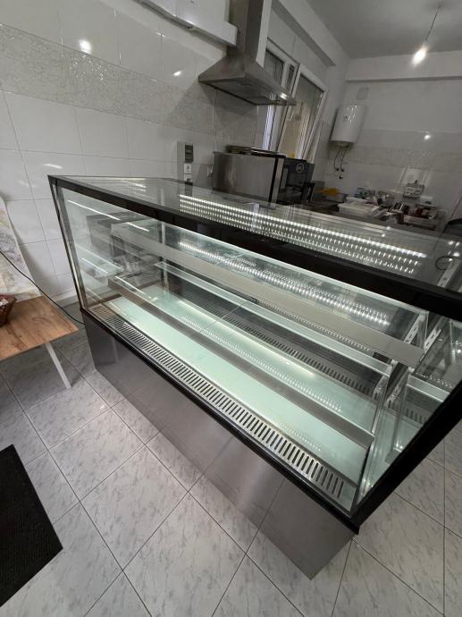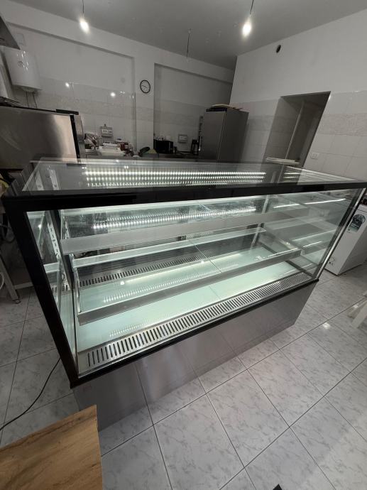Vitrina je funkcionalna, uredna i spremna za rad, s modernim dizajnom koji lijepo ističe proizvode.
