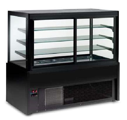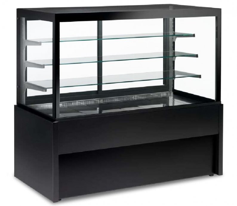 Rabljena rashladna vitrina mod. Kristall 150, dim. 1500x775xh1370 mm, temp. +2/+6°C, ostakljena sa svih strana, snaga 270W, baza + 3 police, dubina baze 570 mm, dubina polica odozdo prema gore 400 mm, 350 mm, 300 mm, police staklene; crna