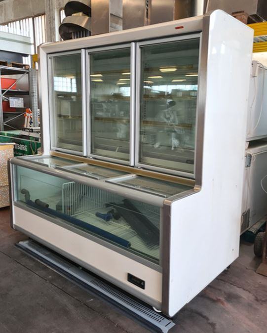 Zidni zamrzivač dim. 1980x1160x2180 mm, dubina baze 840 mm, dubina polica 400 mm, gore sa troja krilna vrata, dolje sa kliznim poklopcima,