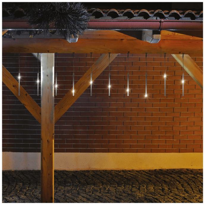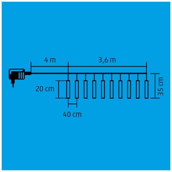 Dekorativna LED rasvjeta, svjetlosni niz,ledenice Dekorativna LED rasvjeta, svjetlosni niz, za vanjsku upotrebu, 200 hladno bijelih LED dioda, 10 ledenica Svjetlosni efekt koji imitira topljenje ledenice, ledenice dužine 20 cm Napajanje: 230 V~ / 7 V adapter, duljina niza 3.6 met., dužina kabela za napajanje 4 met.