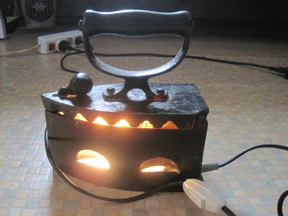 Lampa je napravljena od stare pegle . U nju je ugradjeno grlo , i žarulja koja radi na 220 V . Iznad nje je stavljena metalna mrežica .