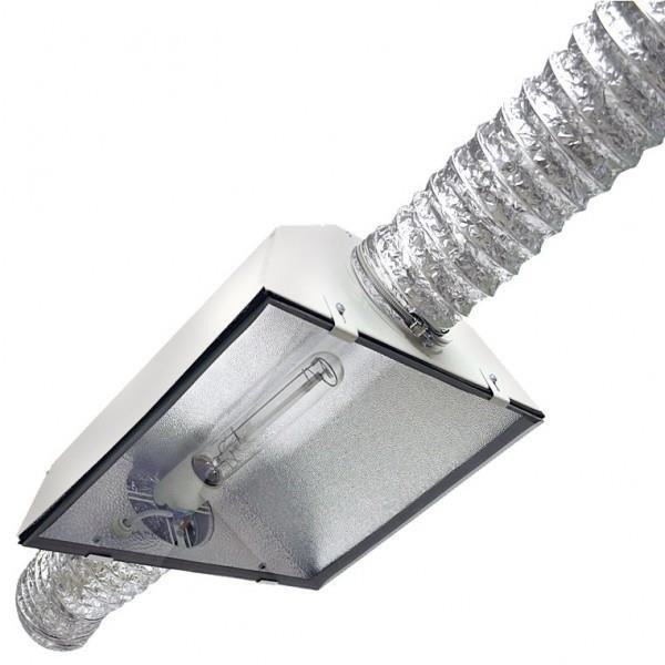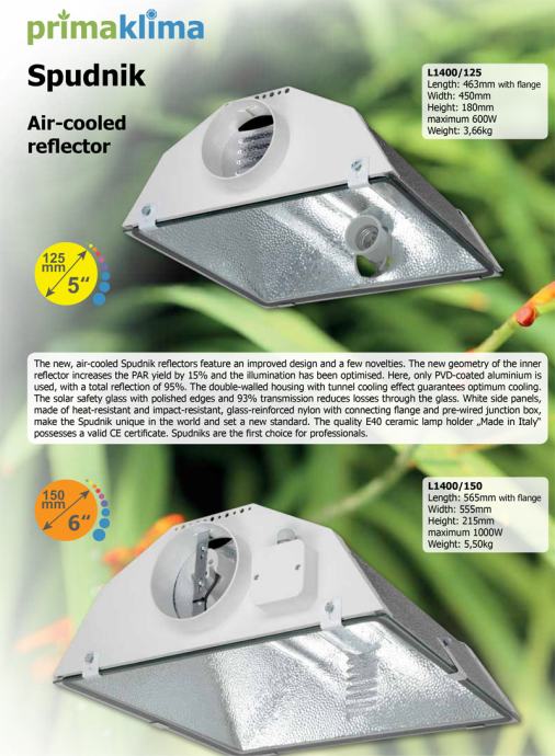 Spudnik je zračni reflektor s optimiziranim dizajnom unutarnjih reflektora za povećanje PAR-a na najviše razine. Aluminij obložen PVD-om osigurava i do 95% refleksije nakon postupka uzorka. Kućište s dvostrukim stranicama i tunelom za hlađenje jamči optimalno hlađenje. Sigurnosno staklo s poliranim ivicama i 93% prijenosom smanjuje gubitke kroz staklo. Bijele bočne ploče, otporne na udarce, najlon ojačan staklom s priključnom prirubnicom i spojnom kutijom od žice, čine Spudnik jedinstvenim u svijetu i postavljaju novi standard. Kvalitetni keramički nosač svjetiljki E40 made in Italy posjeduje valjani CE certifikat.