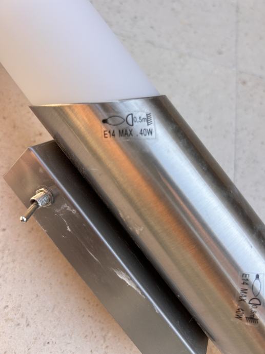 Svjetiljka za kupaonicu, npr. na ogledalu. Širina 44,5 cm. Grlo žarulje E14. Max 40W.