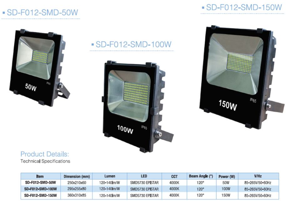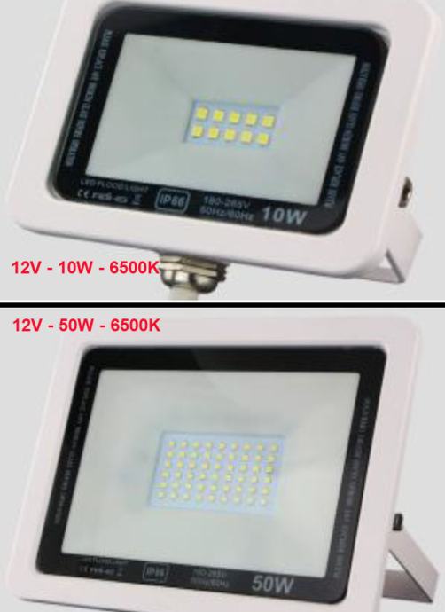 LED reflektori, SMD tehnologija, snage 10W / 20W / 30W / 50W / 100W / 150W, široki simetrični kut svjetla, temperatura boje svijetla 4000K, za vanjsku i unutarnju upotrebu (IP65/66). Napajanje na mrežni napon 240VAC / 12V AC/DC.