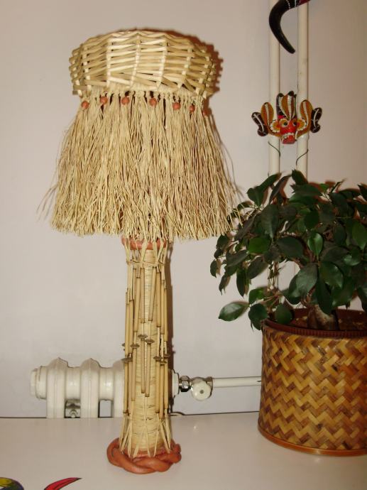 Unikatna svjetiljka, ručni rad, od prirodnih materijala (rafija,glinamol,šibe), vis. 58cm,nova.