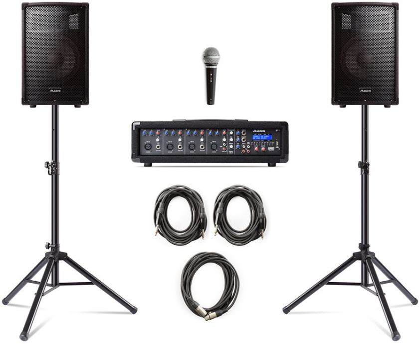 The Alesis PA System in a Box Bundle includes a 4-channel powered mixer with a powerful 280-watt (peak power) amplifier, two 10-inch 2-way, high-output passive speakers and two 20-foot speaker cables, two speaker stands and a microphone with cable--- everything you need for great sound reinforcement, all in one box. It’s perfect for anyone who needs an affordable but complete mobile PA system for a small venue, rehearsal space, presentation, ceremony, house of worship or sporting event.