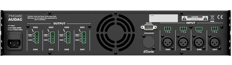 AUDAC PMQ480 is a four channel Class-D 100V power amplifier with an output power of 480 Watt for each channel. The WaveDynamics™ DSP processor combination with the 2.5” LCD display gives an unmatched user experience with intuitive functions overview for easy configuration.