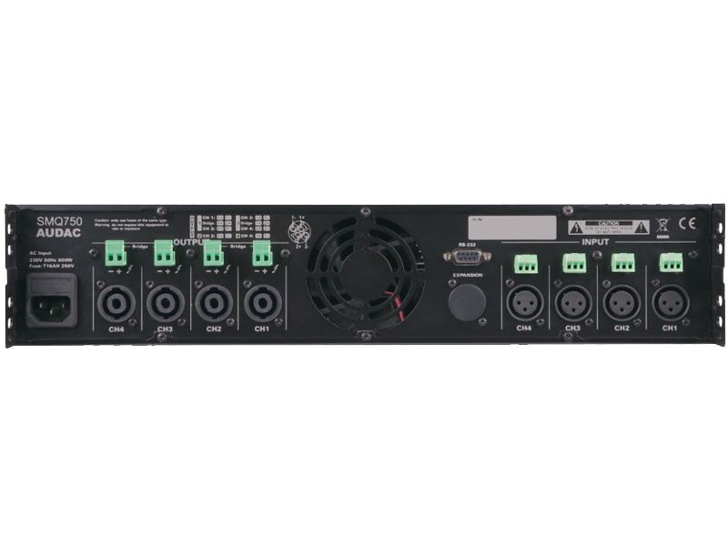 AUDAC SMQ750 is the four channel Class D power amplifier with an output power of 750 Watt for each channel. The WaveDynamics™ DSP processor in combination with the 2.5” LCD display gives an unmatched user experience with intuitive functions overview for easy configuration.