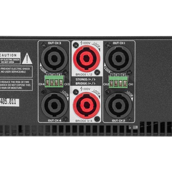 - Power into 8 ohms: 4x 400 W RMS