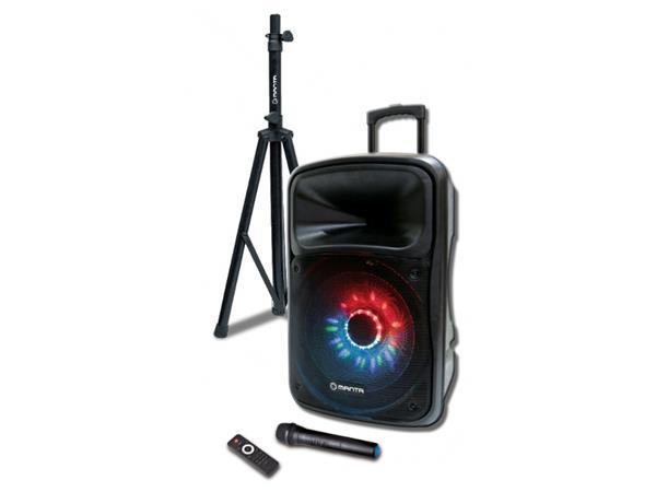 aktivna zvučna kutija 80 watt, s ulazom za gitaru i mikrofon; svjetlosni efekti; u paketu dolazi i stalak, te bežični mikrofon - idealno za Vaše kućne karaoke, rođendane i vrtne zabave !!!