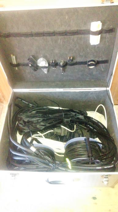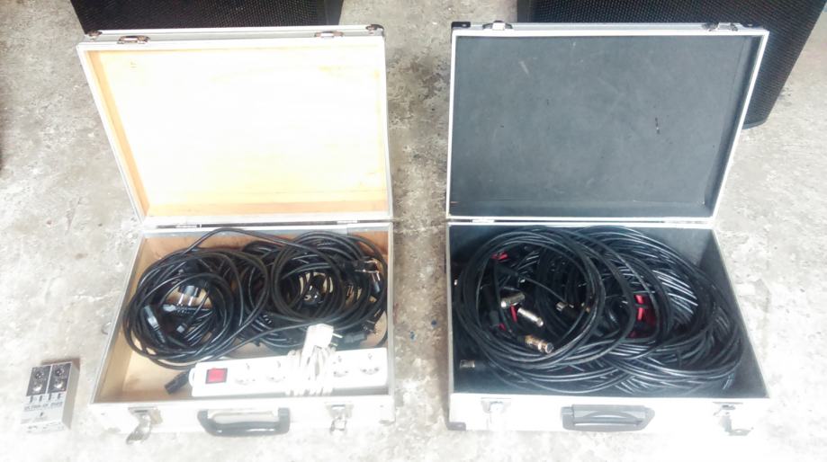 Razni mikrofonski kablovi,kablovi za struju, produžni kablovi, kutije za kablove, stalci za zvučnike, nešto rasvjete...