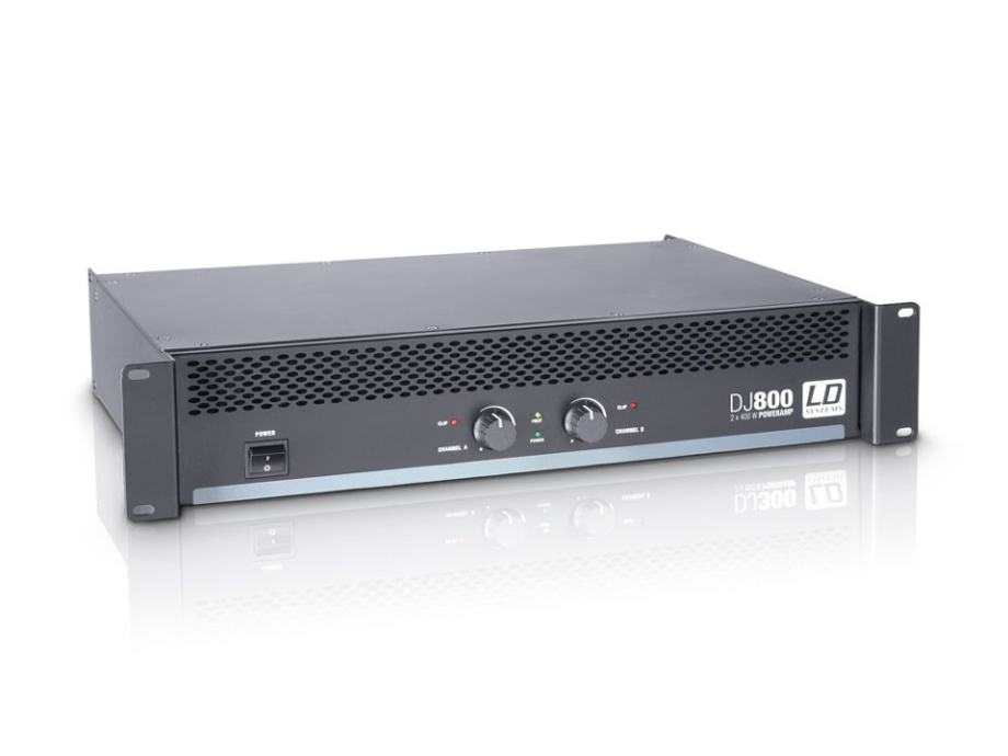 LD Systems DJ800 je pojačalo snage u AB klasi s izlaznom snagom od 400 W po kanalu na 4 oma, 2 x240 W na 8 oma i 800 W u bridge modu. Njegova čvrsta konstrukcija spojena s malom težinom čini ga savršenim za DJ mobilne aplikacije i manje trajne instalacije. Ima opsežni zaštitni sklop, ventilator za hlađenje s niskom razinom buke i kašnjenje pri uključivanju. Ulazni priključci su XLR i stereo TRS, a izlazni Speakon ili navojne stezaljke. Ground-lift prekidač pomaže u uklanjanju brujanja petlje uzemljenja. LED diode na prednjoj ploči pored kontrola glasnoće ukazuju na status rada, preopterećenje i aktiviranje zaštitnog kruga. DJ800 funkcionira u cijelom frekvencijskom opsegu od 20Hz – 20kHz uz visoku pouzdanost, dinamiku i vjernu reprodukciju izvornog zvuka.