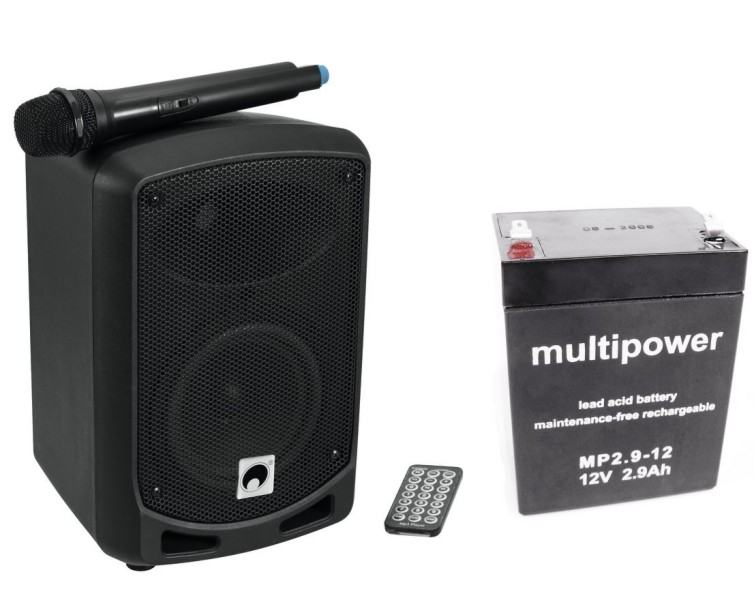Portable PA system with UHF receiver unit, audio player, Bluetooth and battery
