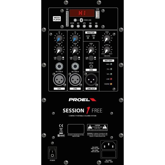 Proel SESSION1FREE BLUETOOTH prijenosni razglasni sistem. Proel SESSION1FREE razglasni sistem sa višestrukim ulazima i MP3 playerom sa BLUETOOTH vezom. Smješten u laganim, ali iznimno izdržljivim polipropilenskim kućištima, sastoji se od stupa s četiri 2,5” zvučnika punog raspona visoke razlučivosti i snažnim 8” subwooferom. Vrhunska elektronika uključuje sofisticiranu sekciju pretpojačala s aktivnim filtriranjem i dvostrukim CLIP LIMITER-ima, te snažno 2-kanalno pojačalo D klase od 400 W. Ugrađena Li-ion baterija omogućuje do 8 sati neprekidnog rada bez napajanja, za maksimalnu slobodu korištenja. Ugrađeni MEDIA PLAYER može reproducirati pjesme sa SD kartice ili USB MEMORIJE, ali i sa Vašeg pametnog telefona ili tableta putem BLUETOOTH veze, bez potrebe za bilo kakvim kabelom. Ugrađeni 3-kanalni mikser omogućuje spajanje dva mikrofonska ili linijska izvora i stereo playera, a svaki sa neovisnim level kontrolama. Digitalni EFFECT također je dostupan za mikrofonske ulaze. Jednostavnim gumbom moguće je optimizirati zvuk za govor, glazbu ili aplikacije s niskim pojačanjem, te prilagođavajući sustav svakoj situaciji.Proel SESSION1FREE može se koristiti u raznim aplikacijama, od govora i reprodukcije glazbe do glazbe uživo ili DJ nastupa.