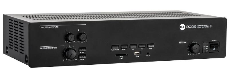 ES 3080 is an 80 W mixer-amplifier with a MP3 player directly accessible on the front panel. It can read USB sticks, SD cards, has an auxiliary input port with 3.5mm jack and Bluetooth technology for the connection with external sources