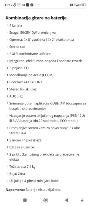 Prodajem Roland Cube Street Ex - pojačalo za gitare, kombinaciju više instrumenata + mikrofon. 4 kanala. Snaga: 50/25/10W - promjenjiva. Kupljen 05. mj. 2024 i vrlo malo korišten te pod garancijom - stanje: kao novo. Cijena 530 eura. Lokacija: Kastav. Kontakt: 0959002855
