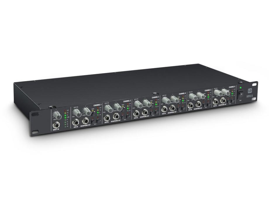 LD Systems HPA 6 iznimno je kvalitetno pretpojačalo za slušalice u formtu 19″ sa 6 potpuno neovisnih kanala i raznolikim značajkama za profesionalnu upotrebu za potrebe monitoringa. Svaki kanal ima 6,3mm TRS ulaz za slušalice s potenciometrom za podešavanje glasnoće, prekidačem za mono/stereo, diskretno gašenje kanala left/right kao i 6.3 mm TRS Aux ulaz s Main/Aux podešavanja za druge priključene uređaje. LED pokazivači omogućuju vizualno praćenje signala, a sa po 2 dodatna izlaza po kanalu na stražnjoj strani moguće je u konačnici priključiti čak 18 pari slušallica. Isto tako, na stražnjoj strani imaju priključci glavnog stereo ulaza i stereo izlaza za spajanje daljnjih uređaja u lanac.