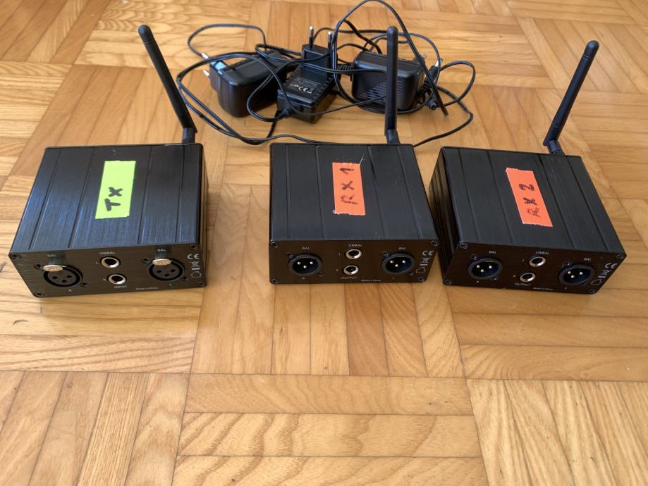 Prodam bezžični set 1x trensmitter, 2x receiver za bezžični prijenos audio signala.