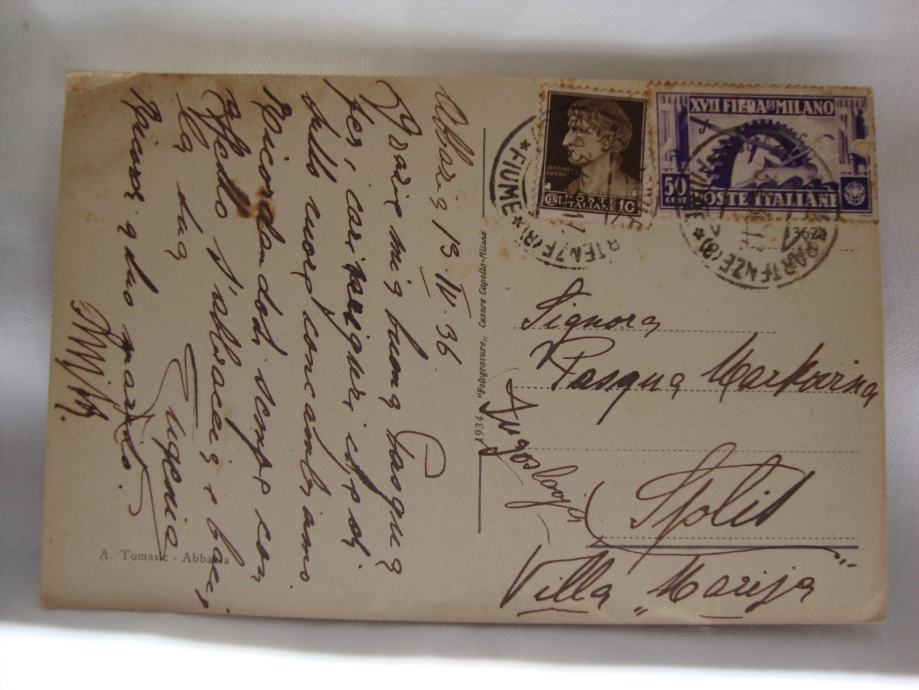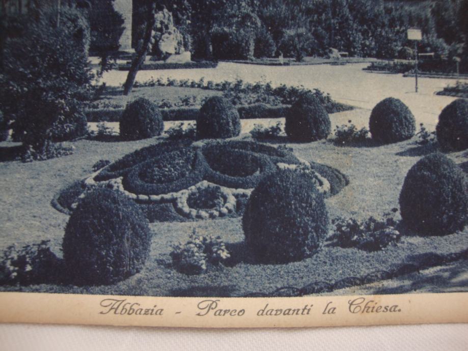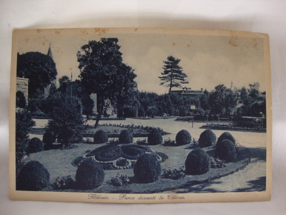 ABBAZIA old postcard 1936 Parco davanti al Chiesa - dopisnica -putoval