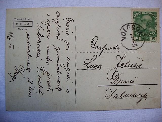 Stara dopsinica Opatija Tomašić & Co. Abbazia - putovala 1914. godine u Drniš iz Volosco
