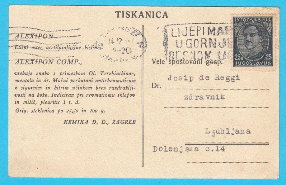 Prekrasna stara razglednica (dopisnica) putovala 1930-tih godina iz Zagreba (Kemika d.d. Zagreb) liječniku Dr. Josip de Reggi u Ljubljana (Slovenija).