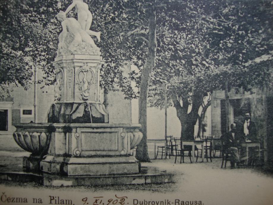 Predivna kolekcionarska razglednica sa motivom Amerlingiove čezme (fontana ) na Pilamu u Dubrovniku prikaz dvaju muškaraca