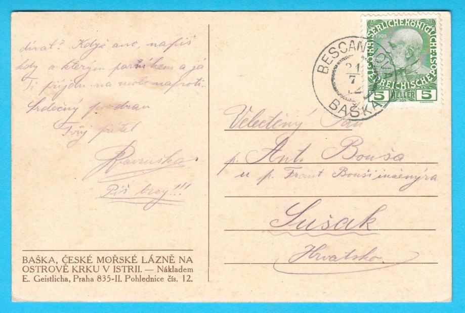BAŠKA ( otok Krk ) stara austro-ugarska razglednica, putovala 1912.g.