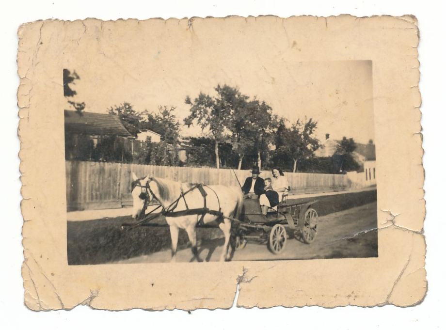 Na poleđini piše: Bjelvoar 1936. Križevačka cesta. Konj "zelenko" upregnut u fjašvagen na putu za Zrinjski Topolavac