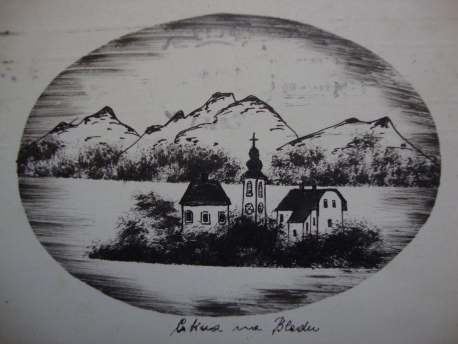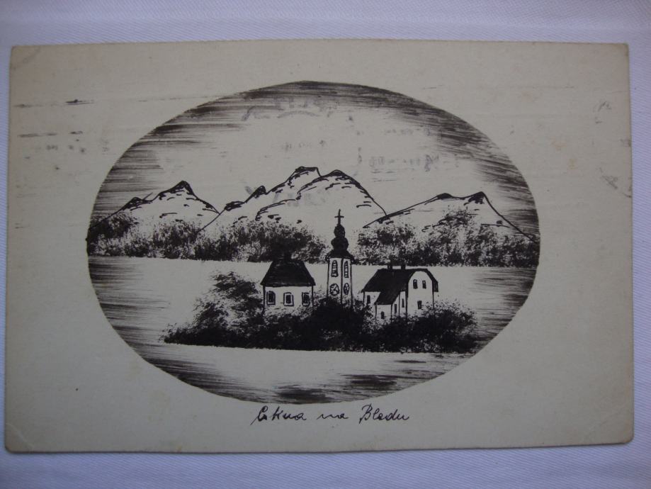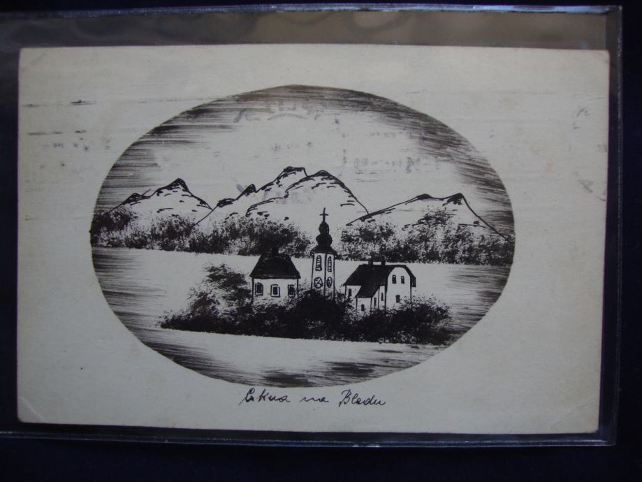 Umjetnička dopisnica izrađena tušem motiv Crkva na Bledu u Sloveniji