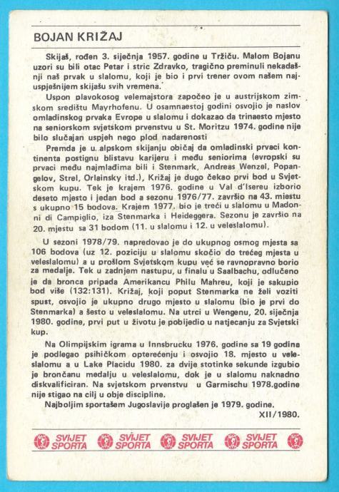 BOJAN KRIŽAJ kartica svijet sport, kao razglednica Slovenija Skijanje