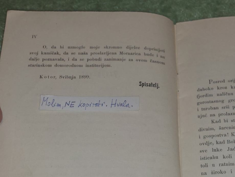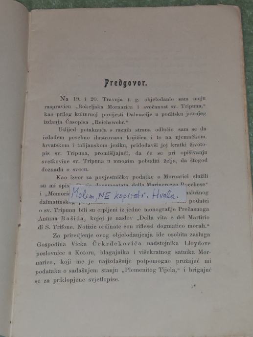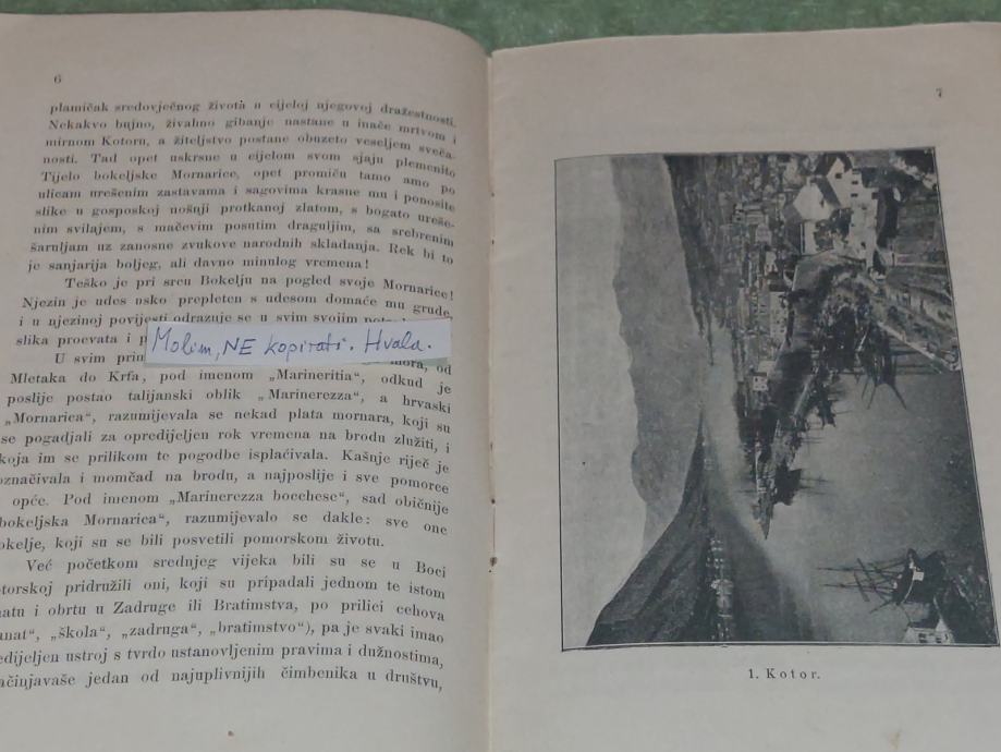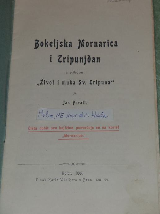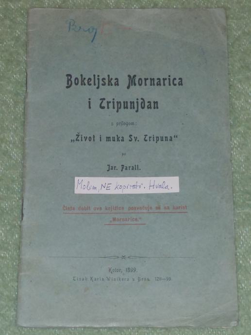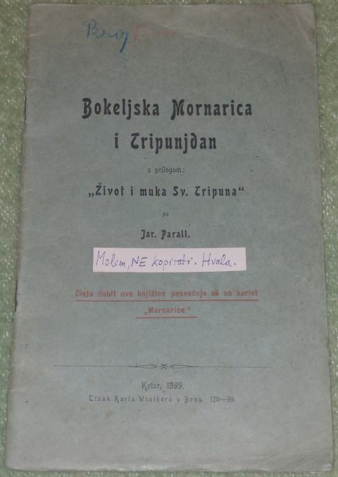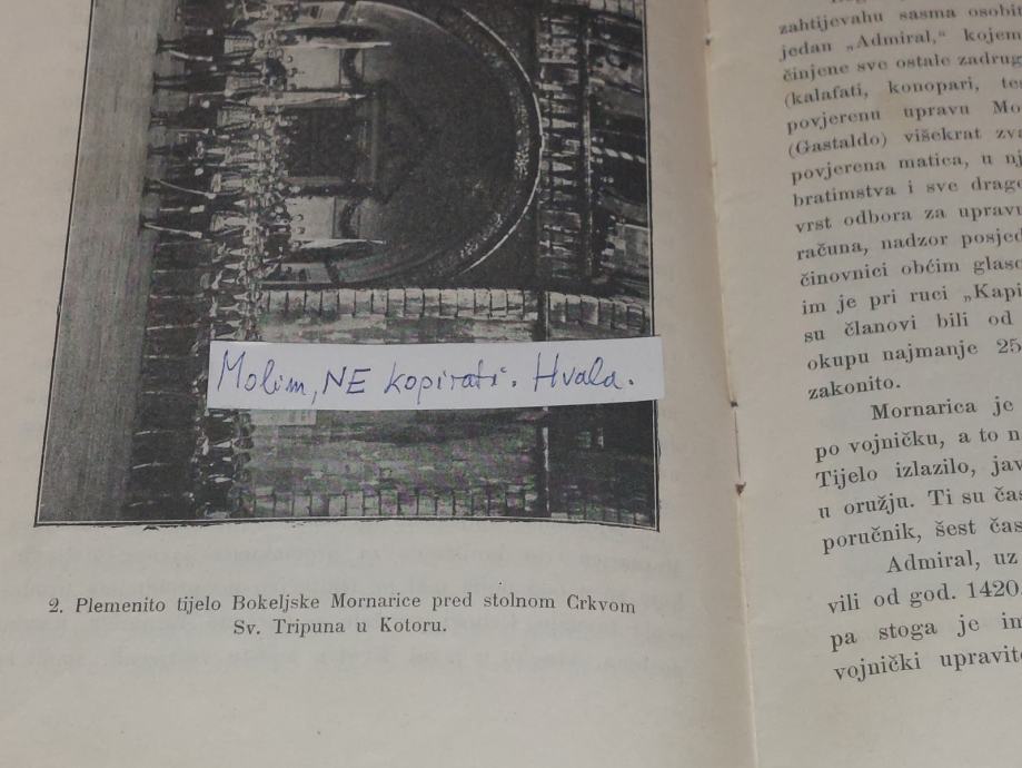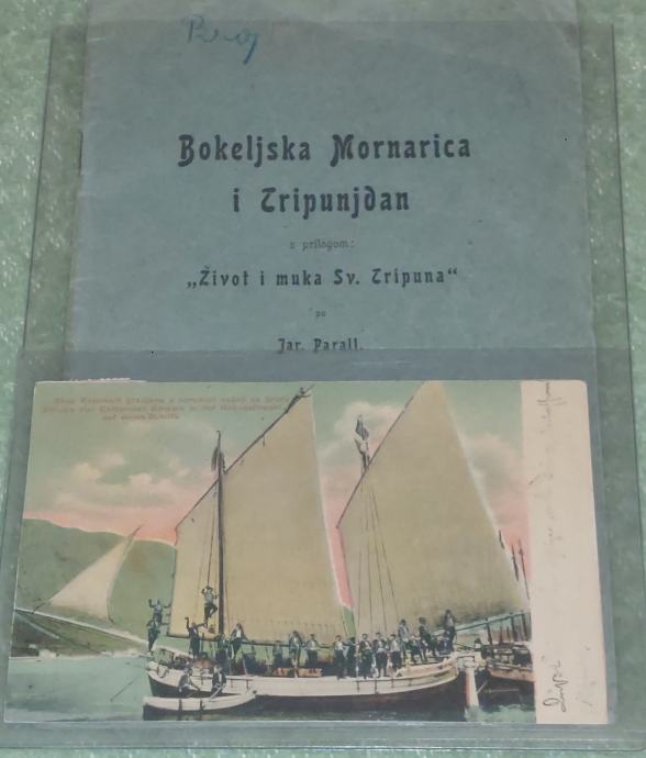 JAKO RIJETKA AUKCIJA ANTIKNE KNJIZICE IZDANE U KOTORU 1899.g. - "BOKELJSKA MORNARICA I TRIPUNJDAN" - SA ORIGINALNOM STAROM RAZGLEDNICOM S POČETKA 20.st. (PUTOVALA JE 1908.g.) KOJA PRIKAZUJE JEDRENJAK BOKELJSKE MORNARICE SA POSADOM (BOKELJSKI MORNARI U NARODNOJ NOŠNJI). Lp