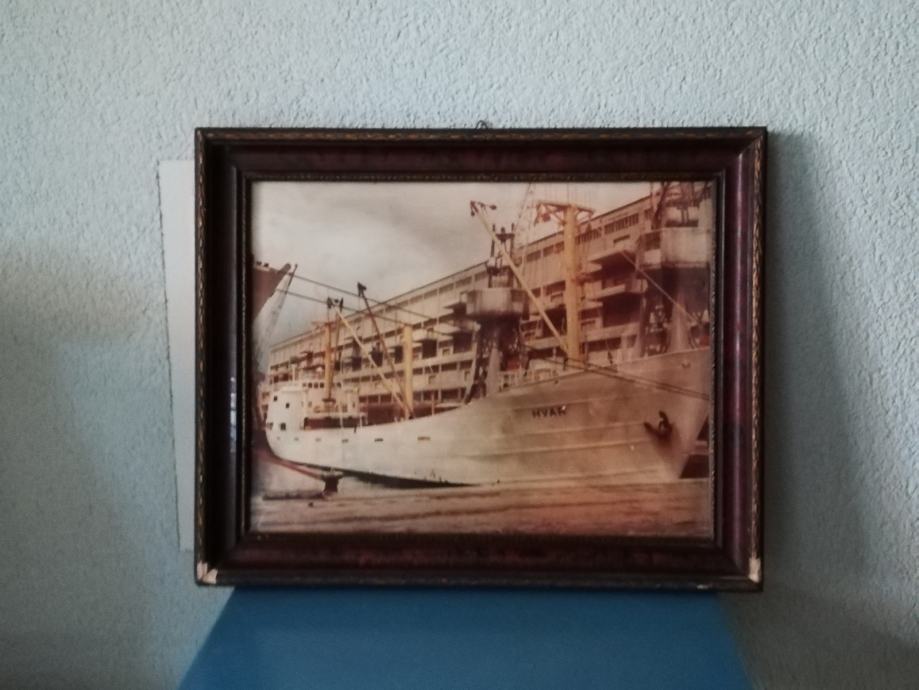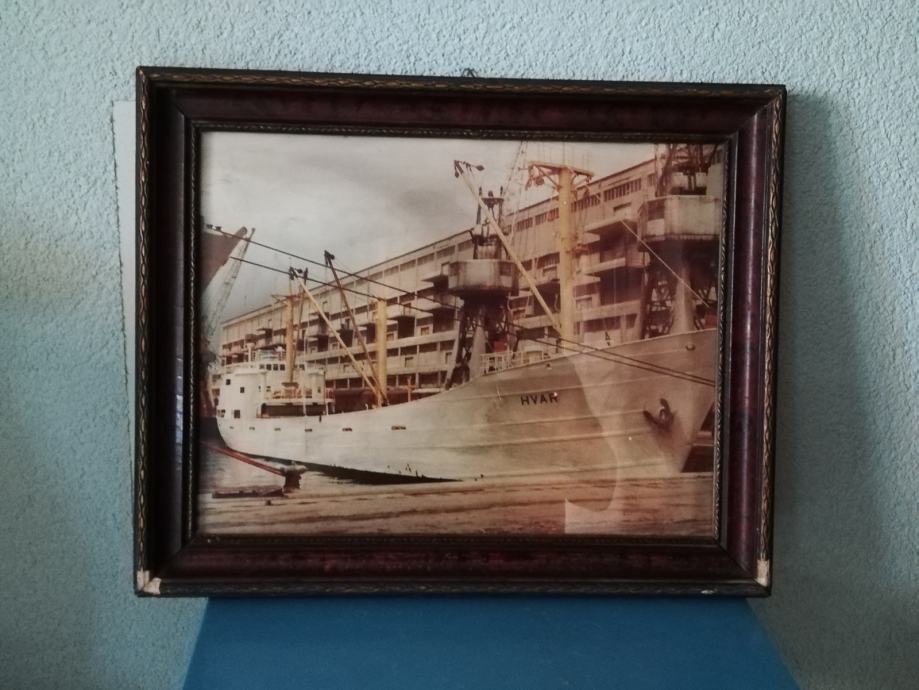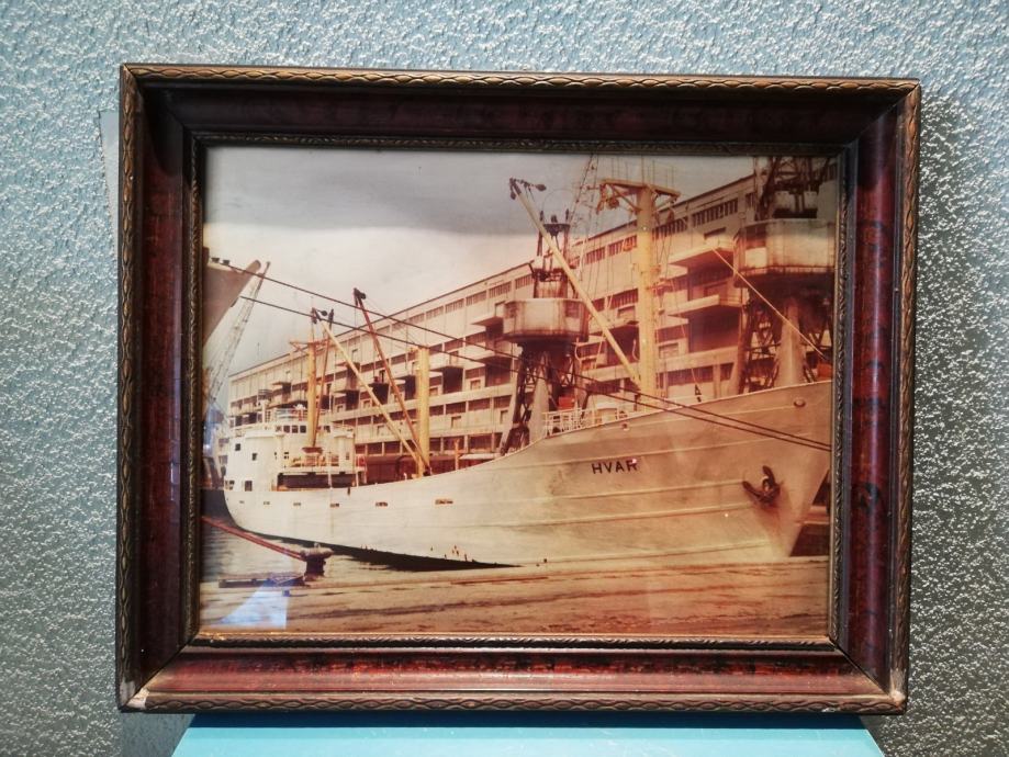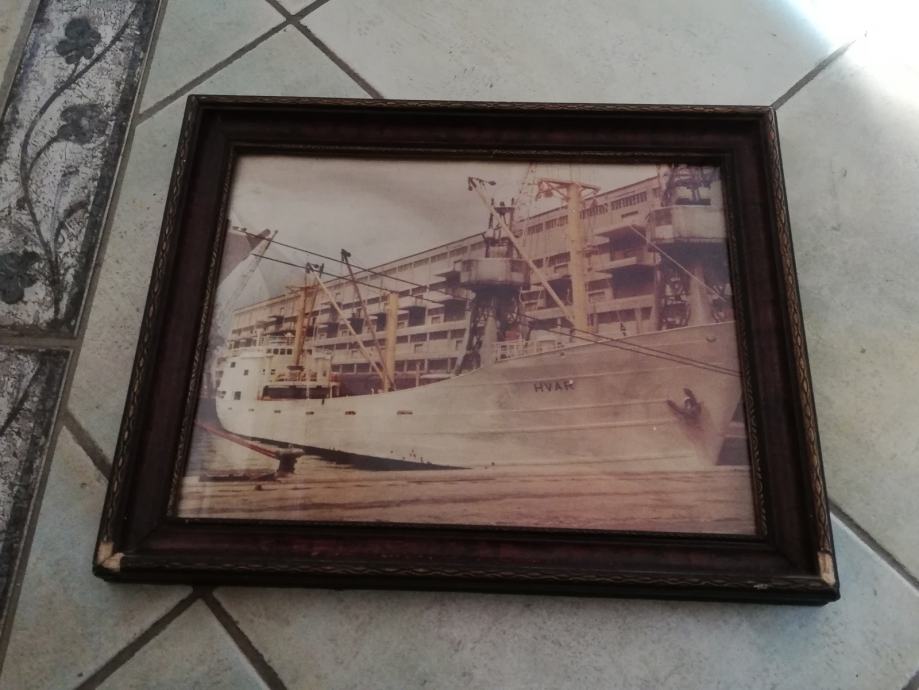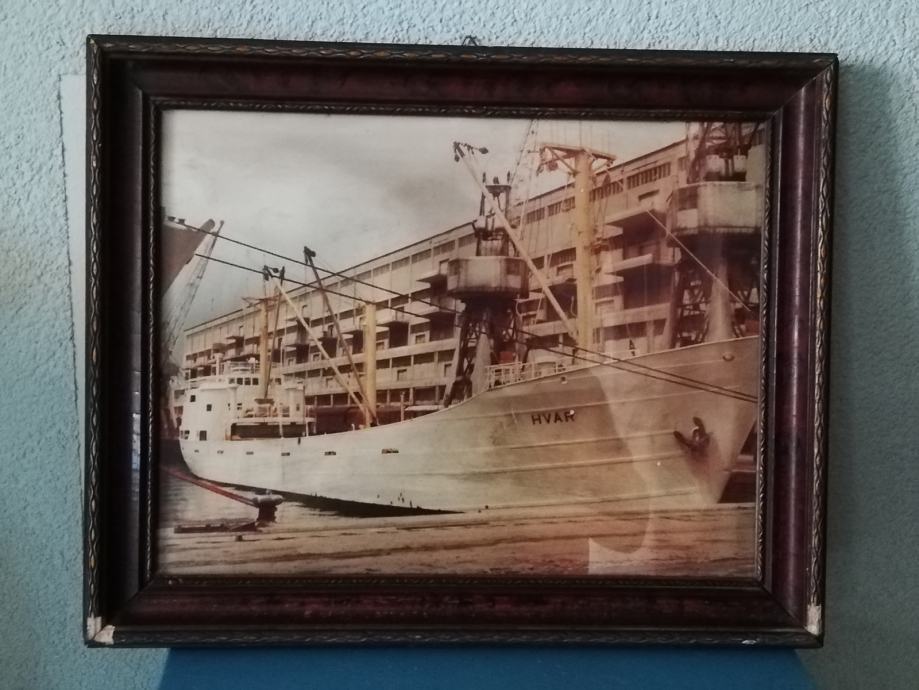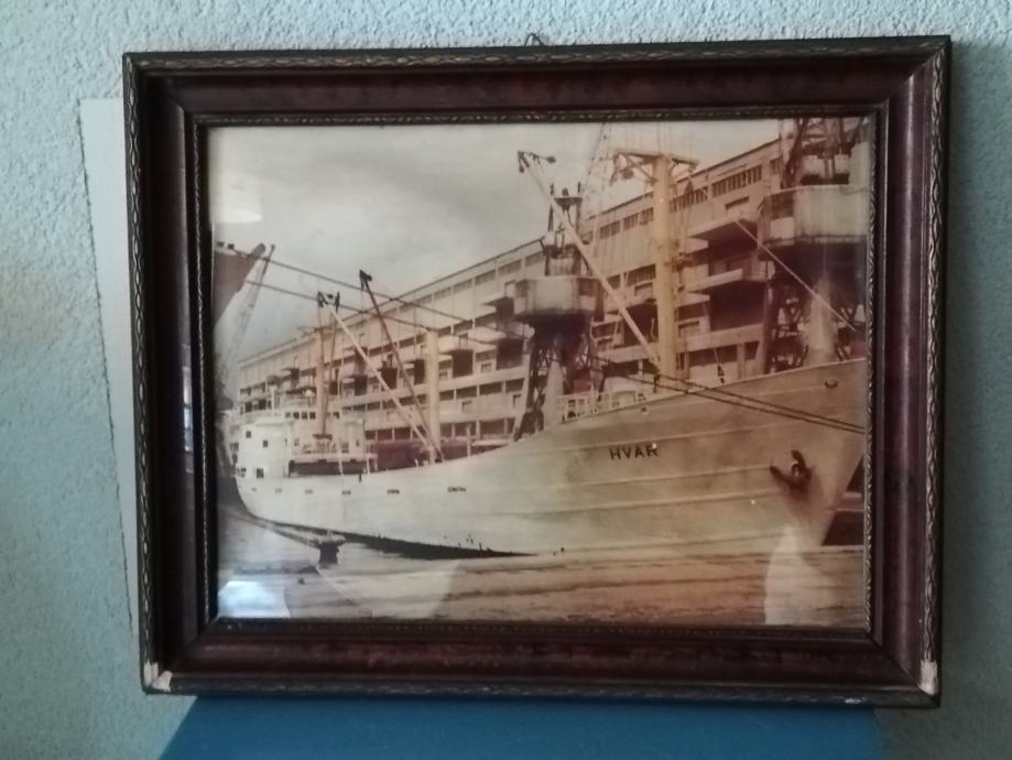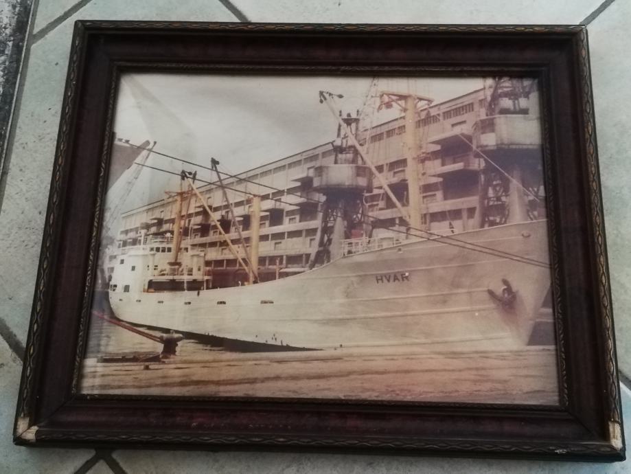 Fotografija broda Hvar, uramljena i ustakljena, nepoznata mi je godina, niti brodovlasnika, stanje fotografije odlično, okvir, malo oštećen. Dimenzije sa okvirom: 44,3 x 35,6 cm. Okvir debljine 3,0 , širine 4,0 cm.