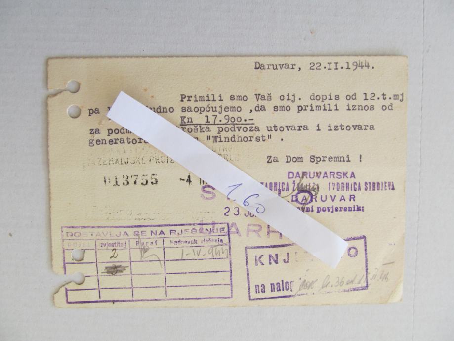 poslano 22.II 1944. poštarinu plača kupac-plačanje na tekući