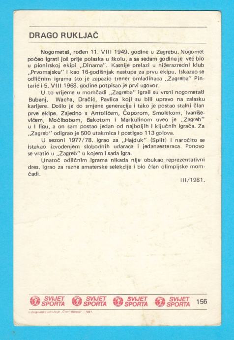 DRAGO RUKLJAČ NK Zagreb Hajduk Split nogometna kartica svijet sporta