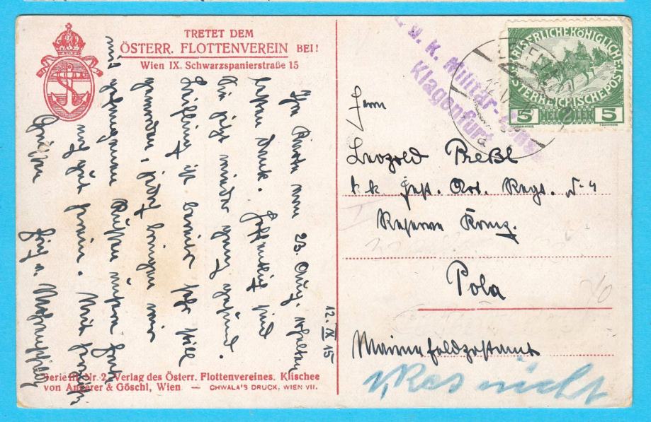 Stara austro-ugarska razglednica sa brodom (jedrenjak) austrijske flote, putovala 1915. godine u Pulu (Pola).
