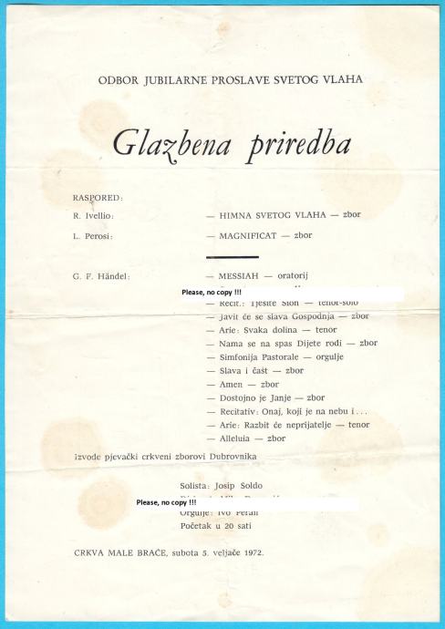 Stari originalni program glazbene priredbe u organizaciji Odbora jubilarne proslave Svetog Vlaha 1972. godine.