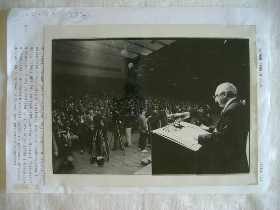 Franjo Tuđman govori na 1. Općem saboru HDZ-a 24.2.1990. godine u Lisinskom, fotografija iz materijala za knjigu Hrvoja Šošića, 24 x 18 cm, stanje je vidljivo na slici.