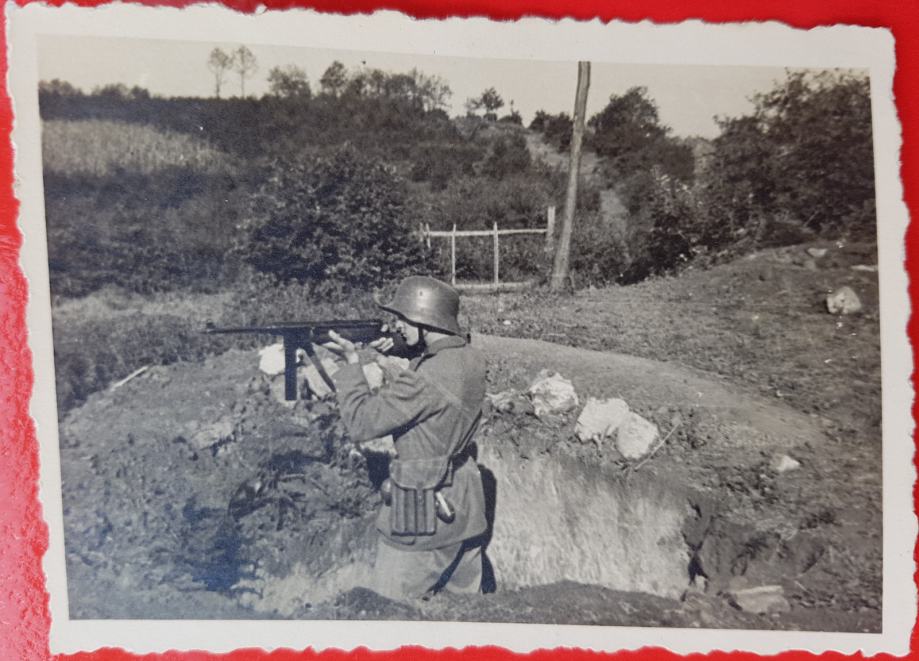 FOTOGRAFIJA PRIPADNIKA USTAŠKE VOJNICE NA POLOŽAJU KOD PETRINE...u rukama dragulj-strojnica MP34...8x6 cm