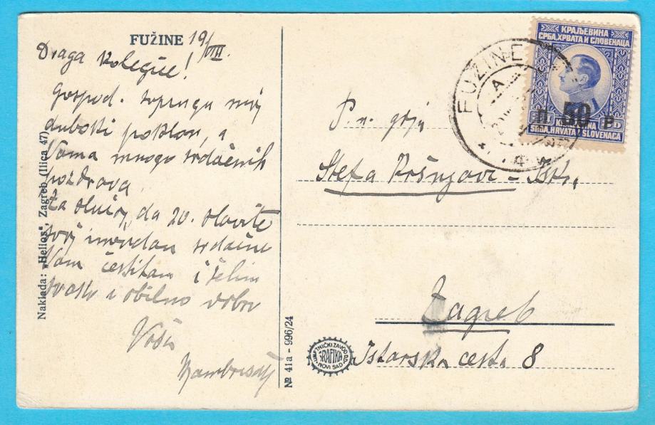 Vrlo lijepa stara predratna razglednica Fužina sa Vilom Ružić u prvom planu, putovala 1930-tih godina.