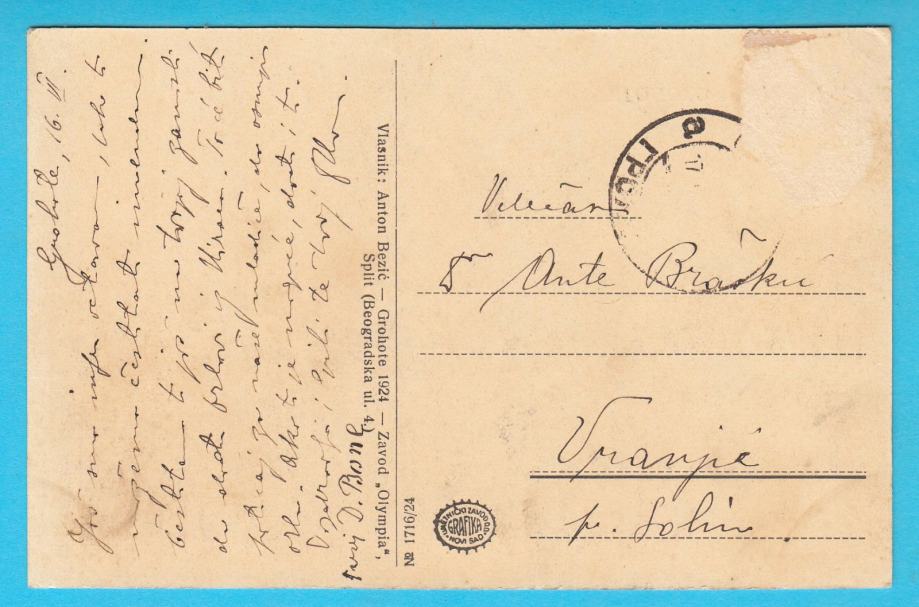 Stara razglednica Grohota na otoku Šolti, putovala 1920-tih godina, bez marke.