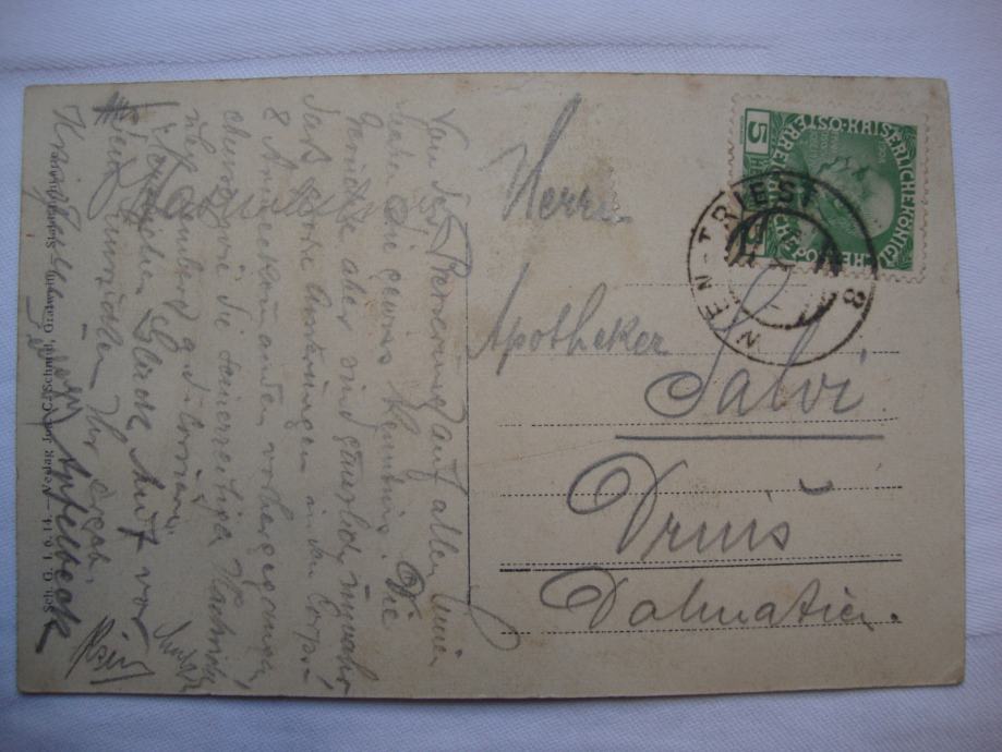 Dopisnica putovala iz wien za Trst pa Drniš žig okrugli sa početaka 20 stoljeća