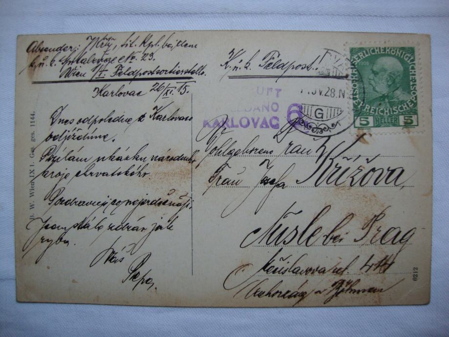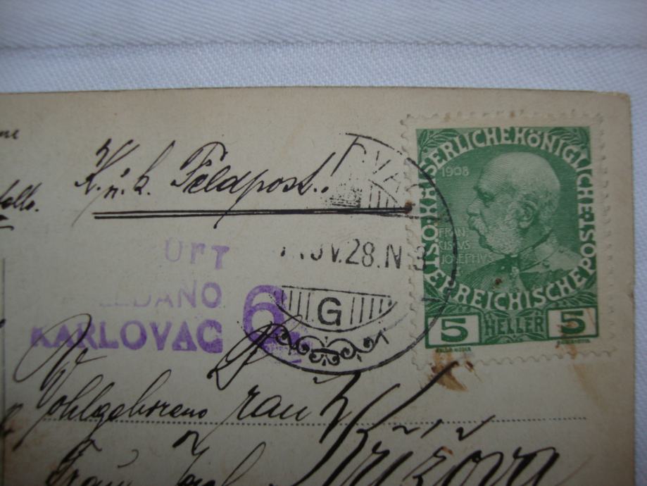 Putovala 1905. godine te je označena sa ljubičastim žigom Pregledano Karlovac- vojna pošta !